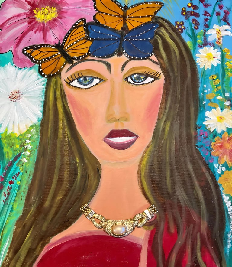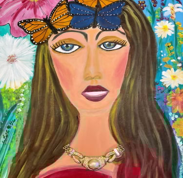 Explore 'Where the Butterflies Rest,' a vibrant 16x20 mixed-media painting by Windsor artist Betty Penny. This unique artwork features a serene female figure, symbolizing resilience and healing, making it perfect for art lovers who appreciate emotional storytelling and nature-inspired pieces.